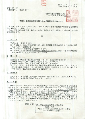 願書提出最終締切日であった2012年8月31日の夕刻ぎりぎりに横浜にある関東運輸局に海事代理士国家試験試験願書をとりに行きました。本当は郵送でも願書は受けとれるのですが、試験申し込み期限がぎりぎりで、そんな手続きをしていたら間に合わなくなってしまったので、直接取りに行くこととなってしまいました。当日、私自身は仕事で行けなかったので、代わりに別の者に依頼して行ってもらいました。そして、自宅に持ち帰ったその願書をすぐに記入し、その日のうちに郵便局の深夜窓口に提出し、なんとか8月31日の消印をもらうことができました。しかし、こうしてぎりぎりに申込書を提出することによって、ちょっとだけ有益な情報も得ることができました。それは、受験番号の数によって、関東運輸局管内では何人受けるのかが分かったのです。そうしていただいた受験票がこのようなものでした。