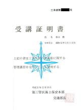 そして、解答用紙を回収し終わると直後に「受講証明書」の授与になるのですが、海上保安庁の方は慣れていないのか、多くの人をスムーズに流す手順がちょっと…でしたので、受講生はどこに並んだいいやらといったハプニングもありました。そして以下の受講証明書を受け取って解散となります。